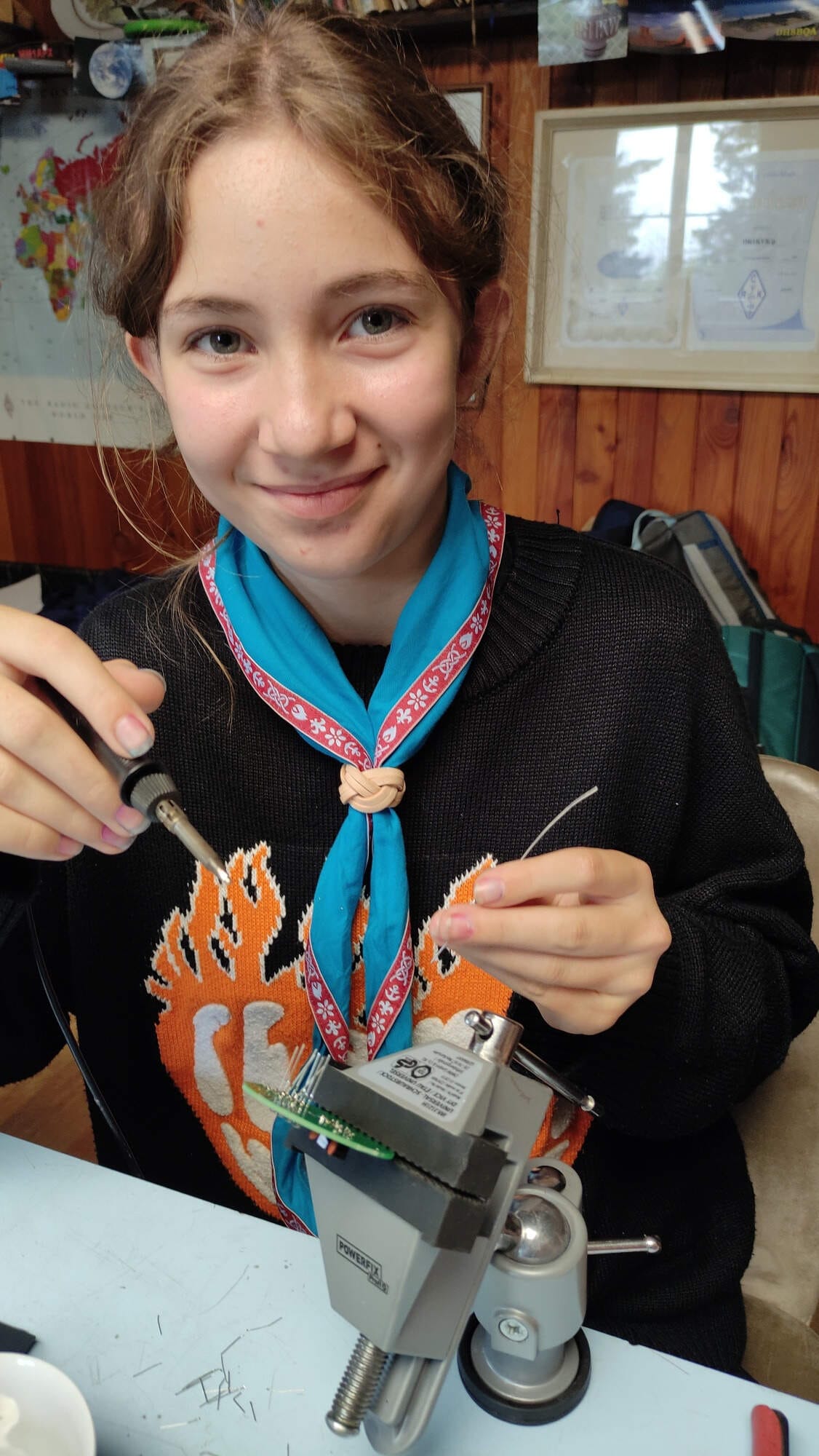 Jako vždycky jsme si připravili nové stavebnice z naší dílny a tak jsme rozjeli například výrobu morseovkových vysílaček – plošňák ve tvaru ruční vysílačky s tlačítkem, pípákem, LEDkou a morse tabulkou přímo na desce.