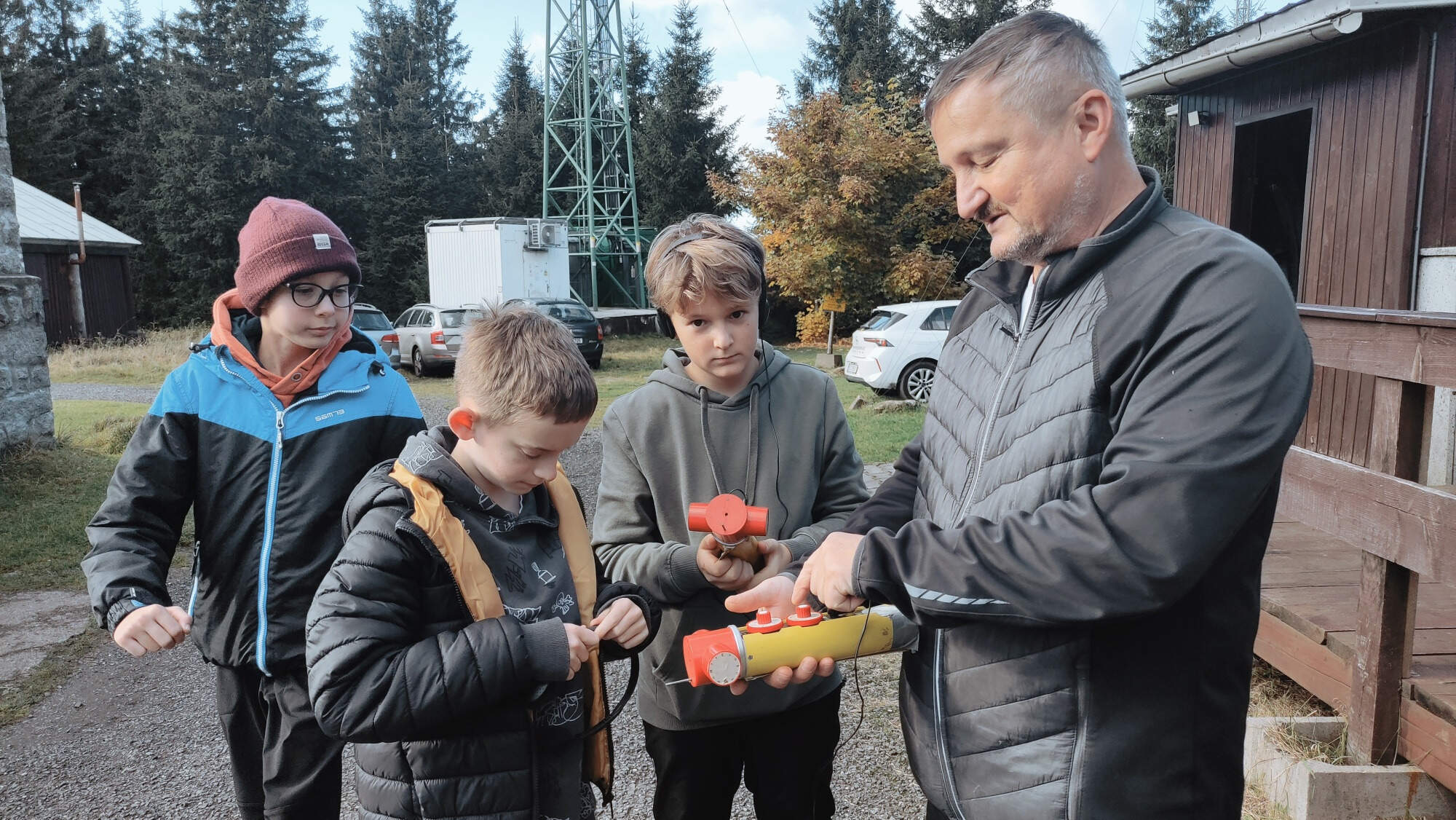 Venku si skauti vyzkoušeli radio-orienteering pod vedením Jirky OK1UBO.