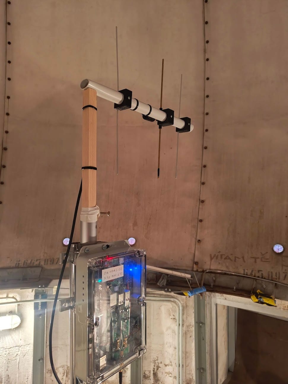 Jako anténu používáme zkrácenou 3EL Yagi namířenou na východ. O příjem telemetrie se starají dvě nezávislé USB SDR připojené k Raspberry Pi. Jedno slouží k příjmu trackerů projektu Dotkni se Vesmíru a druhé je dedikované meteorologickým sondám ČHMÚ.